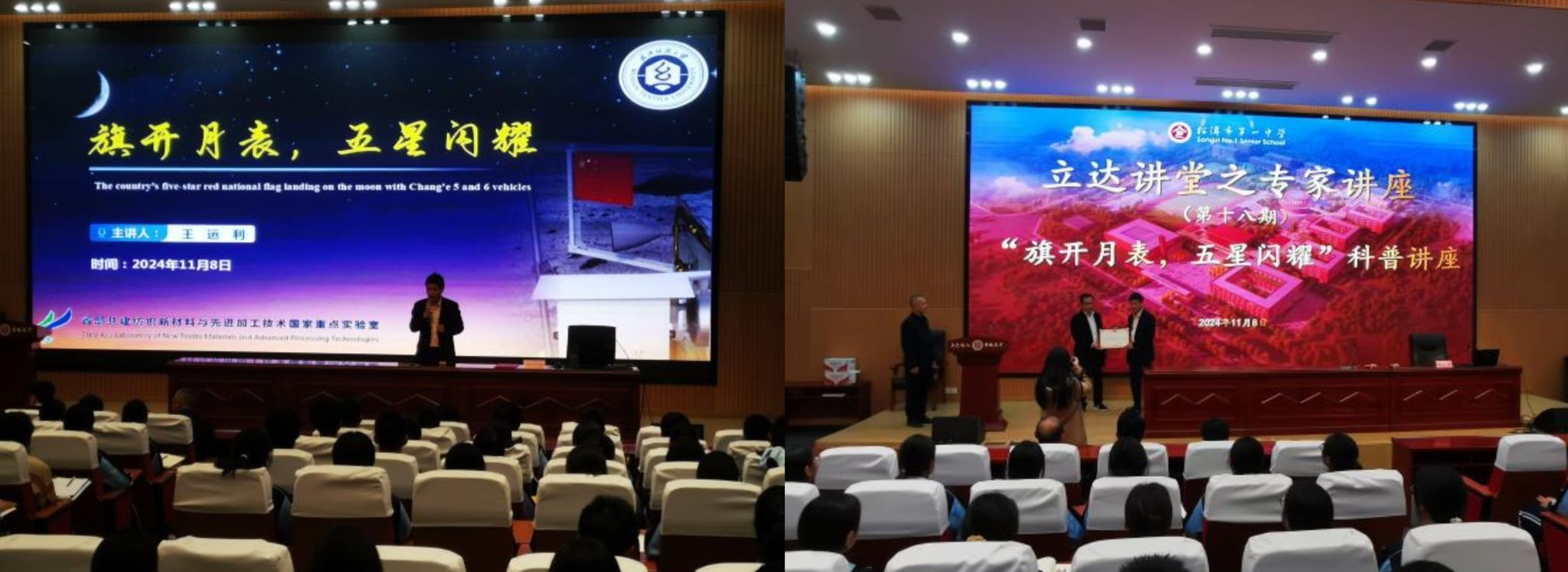 报告会上,王运利为同学们科普了关于宇宙演变的历史,并从太空环境、月球环境、人类探月之旅、太空中的国旗、嫦娥五号及六号月面展示国旗五个方面讲述了月面国旗科研、制作过程中需要破解的技术难题,给高中生们带来了一场生动的纺织科技推动新质生产力发展的科普讲座。王运利教授是徐卫林院士月面国旗研究团队的核心骨干成员之一,他用生动活泼的内容、绘声绘色的语言、精心设计的PPT牢牢锁住了高中生的注意力。班主任们表示“今天的报告会上同学们眼里太有光了”。会上王运利与同学们进行了互动交流,进一步加深了同学们对芒果tv 学的了解,增强了同学们对芒果tv 学的向往之情。会前王运利受聘为松滋市第一中学“立达讲堂”特邀报告专家。