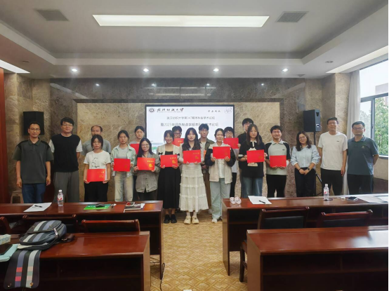 12302何雨婷同学介绍了项目磷离尽致﹣多源固废基可除磷护坡单元的关键制备及运用;生物工程12302胡顺同学介绍了项目码护舌安﹣3D打印三键超级拉曼码用于食品/药品溯源与防伪;纺织学院黄嘉琪同学介绍了项目智慧城市纱线基智能水泥复合材料;环境科学12201刘芷怡介绍了项目铁基调理剂耦合微生物协同修复镉铬污染土壤的界面调控机制;应用化学12301覃妹彤同学介绍了项目亚稳态催化剂突破尿素氧化能垒瓶颈赋能绿色转化;化妆品12202陶冰珊同学介绍了项目智能突释一酸响应绿原酸双层微球的制备及应用;高分子12301王润之同学介绍了项目"纤纸绝缘"﹣聚苯硫醚超细纤维复合芳纶绝缘纸;环工12302吴家辉同学介绍了项目磁碳先锋:磁性多孔碳吸附﹣氧化﹣资源化三位一体驱动抗生素废水高效净化技术;化工12301余梦云同学介绍了项目氢键调控多糖长余辉磷光用于湿度传感的研究;生物工程12301张杰灵同学介绍了项目人雄激素源性脱发治疗;生物工程12302张向楠介绍了项目生物质基席夫碱增强环氧树脂抑烟性能和机械性能;高分子12201周成同学介绍了项目"雾遁卫士"-国内生物质类流体防雾剂开拓者;轻化12201同学周燕霞介绍了项目如虎添翼﹣光热双隐身织物的设计与开发。各位同学汇报结束后,评委老师就项目内容与汇报的同学进行了交流,对各个项目进行了细致的点评指导。交流结束后,评委老师为参与汇报的同学颁发证书并合影留念。