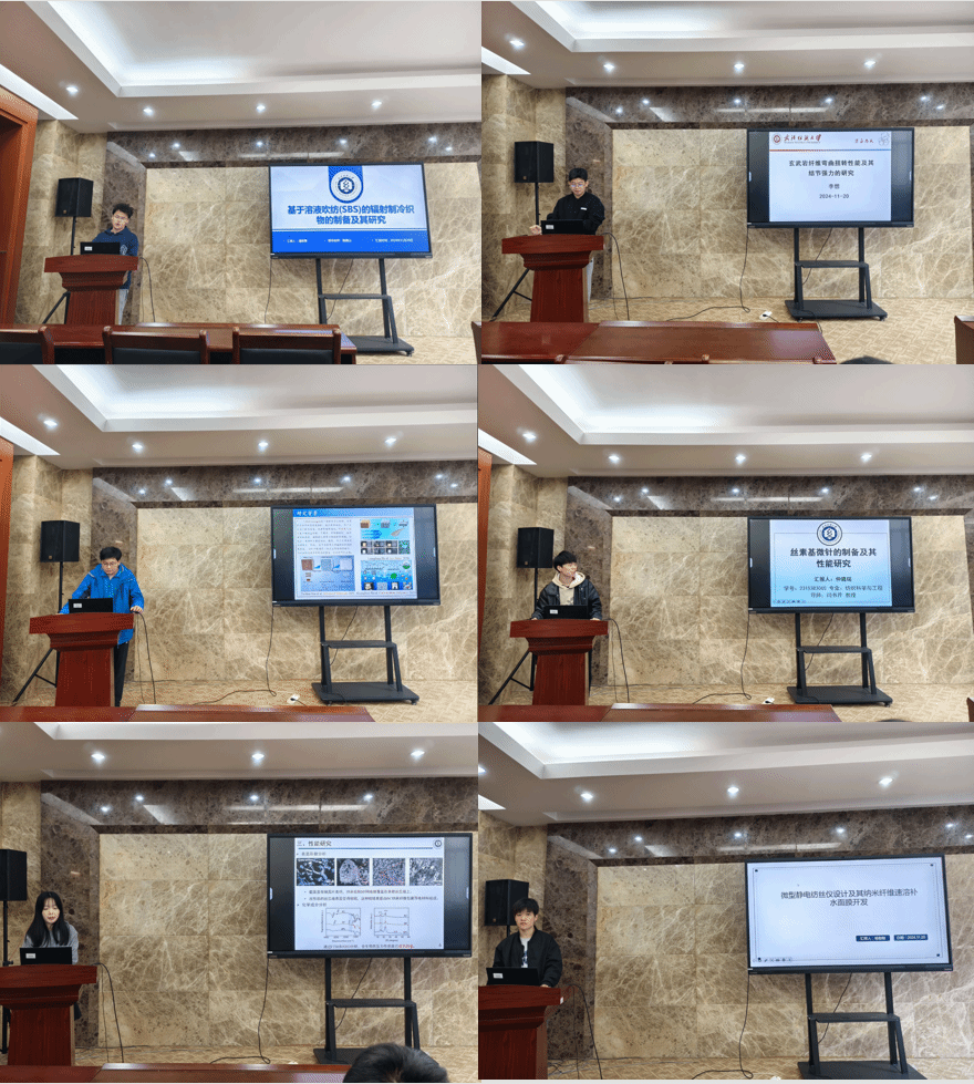 论坛上,潘朝青、李想、张天乐、仲璐瑶、顾宗雪、杨聪聪六位同学依次介绍了自己的研究课题和目前取得的研究进展,并分享了自己的科研经验。主讲同学的研究课题包括辐射制冷织物、玄武岩纤维、芳纶纳米原纤气凝胶纤维、丝素基微针、全生物质压力传感器、微型静电纺丝仪。契合了“纺织新材料及绿色加工”主题,代表了学院最新研究进展,参会人员积极提出问题和建议,营造了良好的学术氛围。