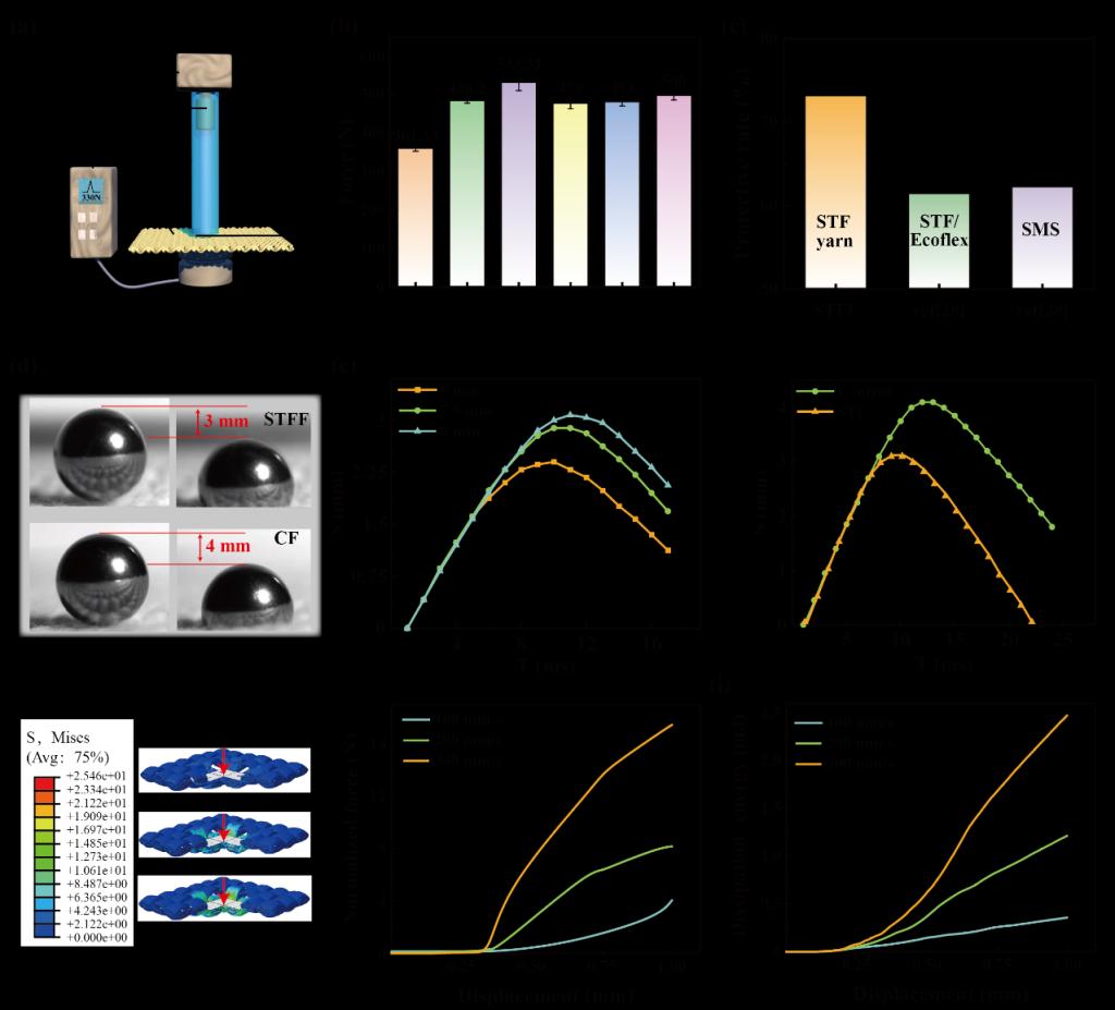 由于STFY具有稳定的层次结构,该纱线及其织物具有柔韧性、透气性、耐磨性和耐洗性等综合优势(图1)。特别是STFY将STF、弹性硅胶材料、金属丝材、柔性纤维等差异化多原料有效层状复构成纱,充分发挥材料由外及内的软、硬、弹、剪切增稠等性能协同,具有优异抗冲击防护能力(图2);且STF含量越多、冲击力越大,STFY抗冲击吸能效果越好(图2)。
