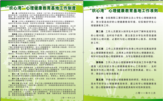 本着“老师做学生的知心朋友,学院是学生心灵的港湾”的工作宗旨,在校学生工作部、大学生心理健康教育中心的大力支持下,在学院党政领导班子和全院师生的共同建设下,大学生心理健康教育基地的设施逐步完善,心理健康教育队伍逐渐扩大,心理健康教育内容日益丰富。同学们通过与我院老师面对面交流、电话交流等多形式交流自身在平时学习和生活中遇到的困扰,通过导师、辅导员和班主任及时的沟通和指导,学生获益良多。“织心湾”已俨然成为大学生的良师益友。