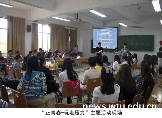 “织心湾”心理健康教育基地在全院开展心理健康主题班会系列活动。5月12日下午,学院举办了一场名为“正青春-玩走压力”的特殊班会活动。