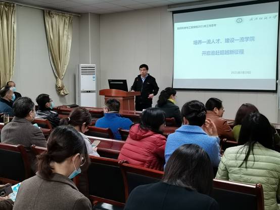 在8H502召开教职工大会,学院党委书记张红鑫为全院教职工做动员报告。