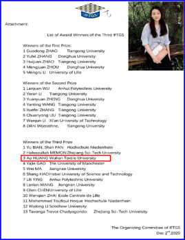 学、西安工程大学、浙江理工大学和天津工业大学共53名研究生作了学术汇报。参与汇报的研究生主要为博士生,我院二年级硕士研究生黄傲同学参与了本次会议,她的学术报告引起了与会人员的很大兴趣,并荣获得三等奖好成绩,展现了我院研究生的良好风采,这是我院研究生首次获此奖项。
