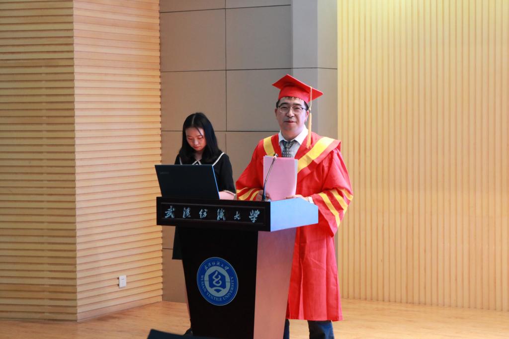 2019届本科生学位授予仪式开始。本次学位授予仪式由蔡光明教授主持,纺织工程系系主任曹新旺老师为2019届毕业生颁发学位证书,张尚勇院长为学士学位获得者拨穗,正冠。
