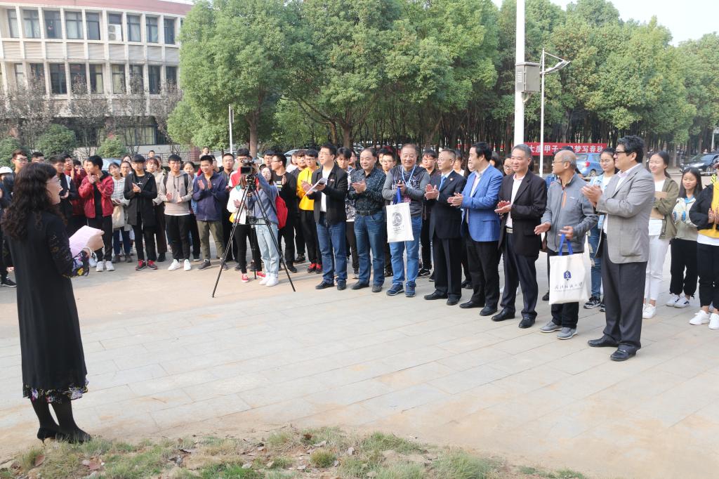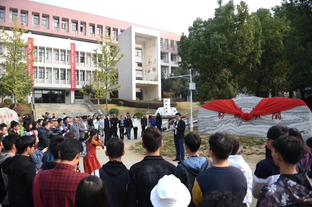 在崇实楼前举行院名院训石揭幕仪式。院名院训石捐赠者——湖北孝棉实业集团董事长孙应安校友、副校长罗锦银、相关职能部门负责人、学院领导和部分师生代表出席本次活动。仪式由院党委常务副书记张红鑫主持。
