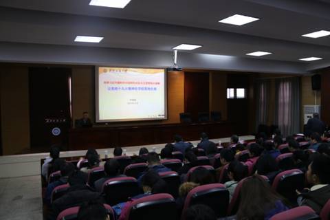 、材料学院全体教职工及部分学生骨干代表在行政楼二楼学术报告厅,听校党委常委、副校长罗锦银关于党的十九大的辅导报告, 罗锦银为大家作了题为“高举习近平新时代中国特色社会主义思想伟大旗帜--让党的十九大精神在学校落地生根”的辅导报告。