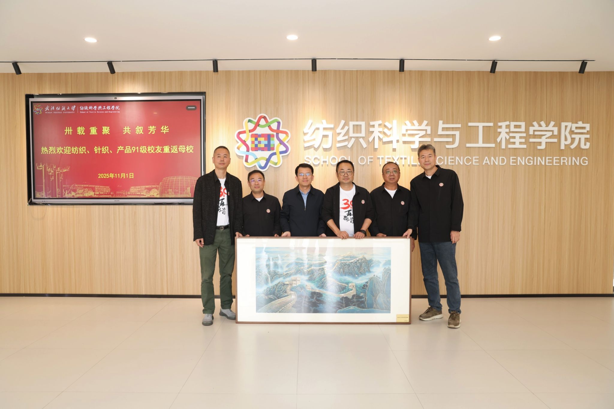 会后,校友代表向学院敬赠铜雕画《众志成城》作为纪念,寓意全体校友同心同德,共筑母校如长城般坚实稳固的基业,祝愿母校教育事业如巍巍长城,屹立长青,蒸蒸日上。校友们还参观了纺织科技馆与荆楚纺织非遗馆,并漫步校园,切身感受母校三十年来的巨大变迁与蓬勃发展。