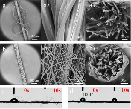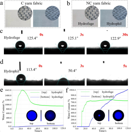 图3(a)和(b)表示C和NC纱线与蓝色棉纱交织形成双面织物。显然,NC纱织物表面更光洁。NC纱线织物两面具有相反的透水性能有:液压分离(N侧)和亲水(O侧),MMT测试结果如图3(e)和(f)所示。该研究结果以“Qualified nano-composite yarn for hydrophobic fabric via online nano- and micron-fiber composite spinning”为题,发表在Textile Research Journal(DOI: 10.1177/00405175221124357)期刊上。论文的第一作者为芒果tv