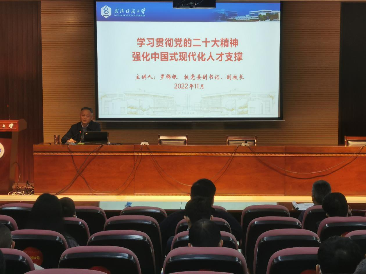 1124日下午,纺织学院在行政楼报告厅举行党的二十大精神宣讲报告会。学校党委副书记、副校长罗锦银作宣讲报告,纺织学院全体教职工参加报告会,报告会由纺织学院党委书记朱张军主持。