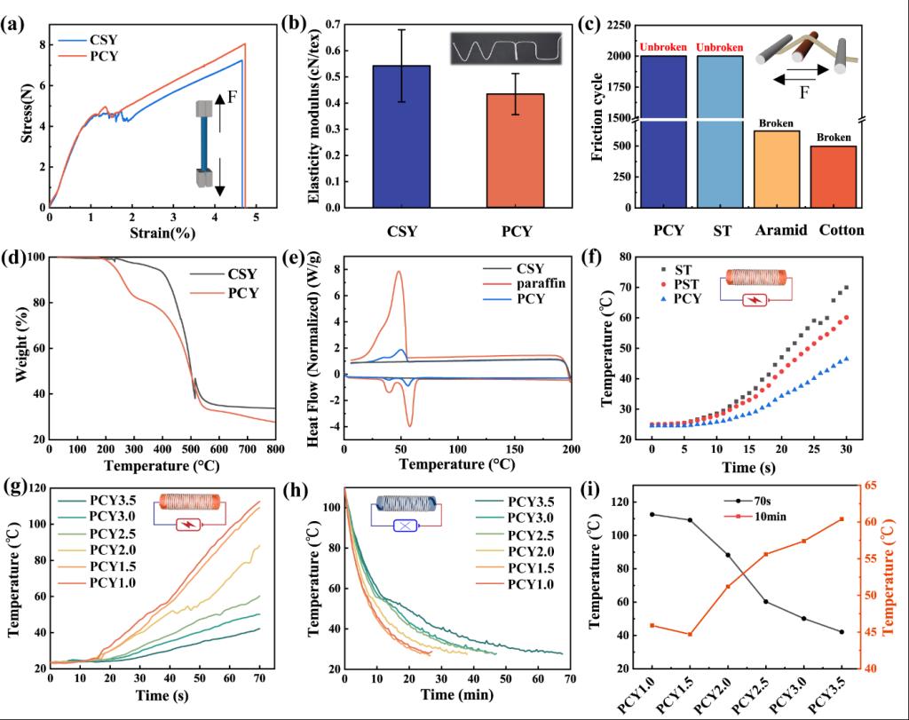 液流纺制备的纱线具有良好的拉伸力学性能(7.80N),耐磨性能(2000次)。石蜡赋予纱线良好的调温的优势(图2)。