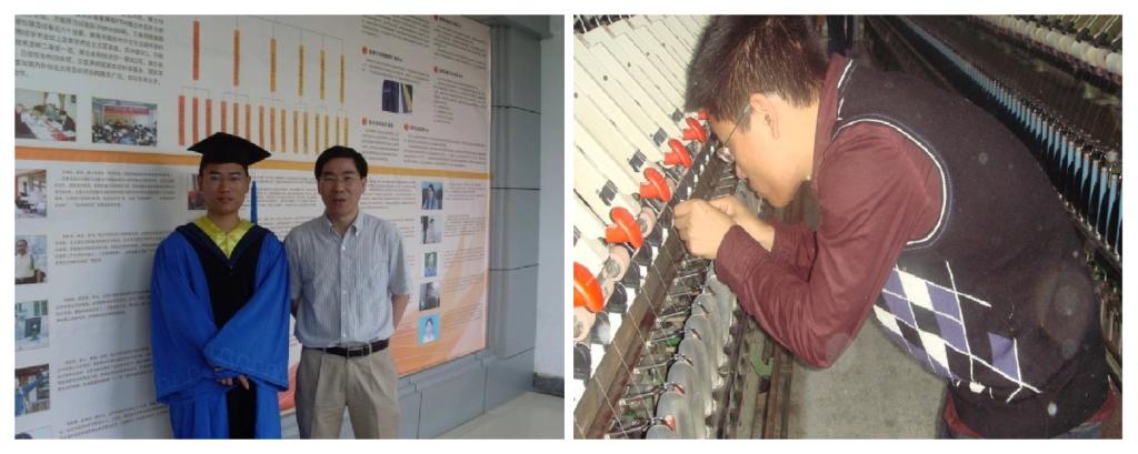 2002年的夏天,夏治刚面临着他人生中第一个十字路口,作为班级尖子生的他却做出了一个让父母、老师、同学都大跌眼镜的决定——第一志愿填报武汉科技学院纺织工程专业。面对其他人“学纺织就是单纯种棉花、织布、做衣服”的担忧,夏治刚却有着不同的看法,说起报考原因,他说:“纺织是我和亲人朋友从小就接触的行业,我是农民的孩子,安徽多是平原,小时候我站在小土坡上也没看得多远,终于有机会能去见识外面的世界,能去学习更多的知识,那我就要研究这个我亲人朋友都离不开的专业,争取干出样来,再回馈他们!”这粒纺织的种子在这时就在夏治刚心里生了根。后来,在面对人生多个十字路口——2006年研究生报考和2009年博士报考时,夏治刚一直坚持纺织工程这一个方向、一个课题,在硕博期间,他跟随着导师徐卫林的步伐,在纺织企业一线了解需求、提供方案、为学校带回行业发展动态,6年的硕博生涯,其中4年的时光他都企业度过,他也成为了同学口中的“企业学生”。2013年3月,夏治刚以老师的新角色继续坚持着他的纺织梦想。