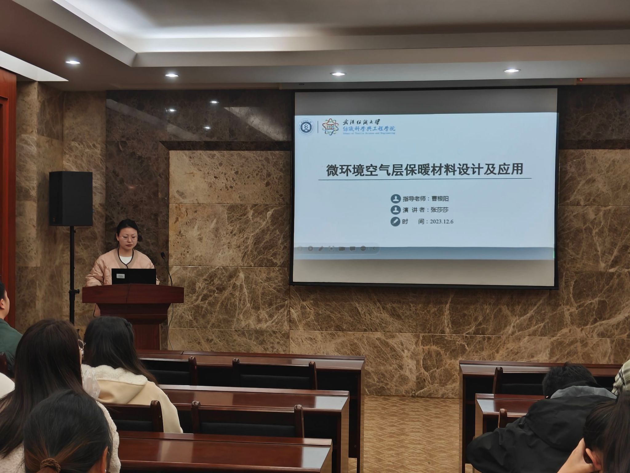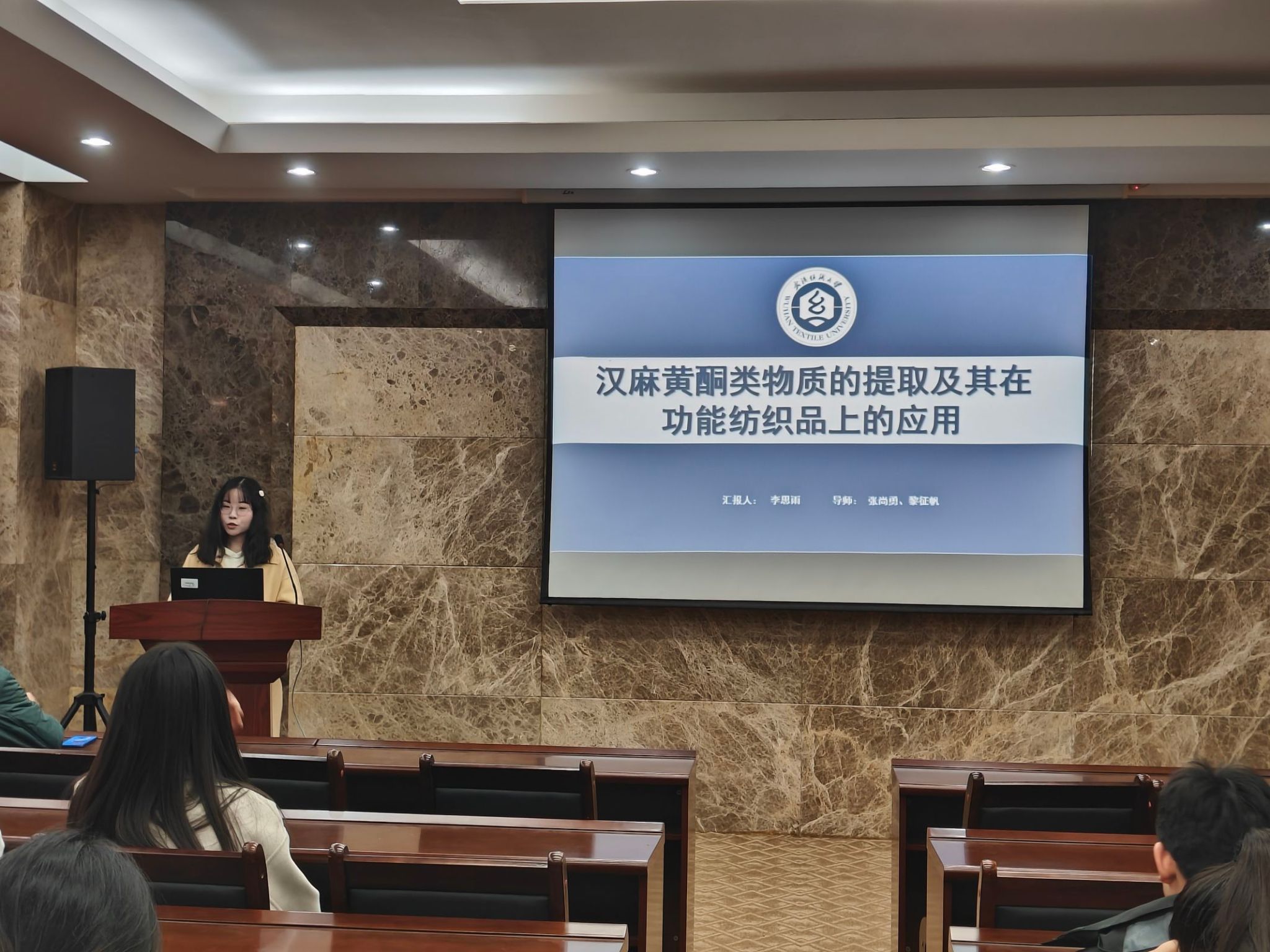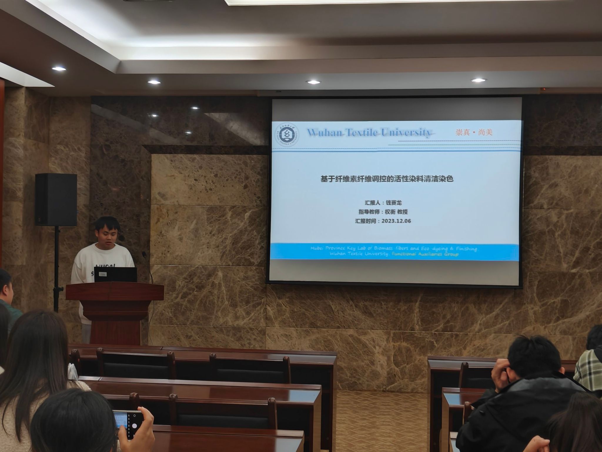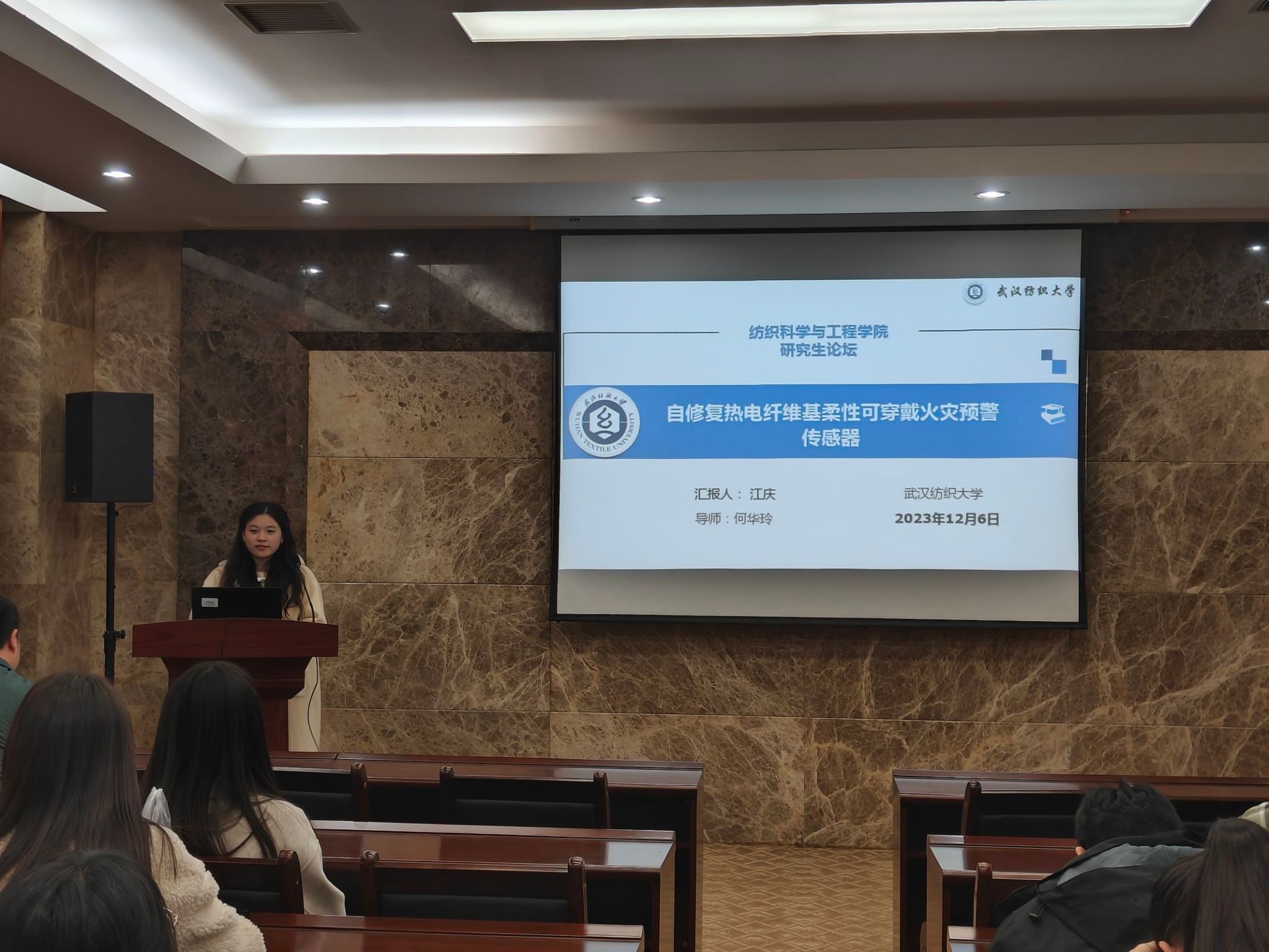 论坛上,李思雨、江庆、钱赛龙、万宇航、张莎莎五位同学依次介绍了自己的研究课题和目前取得的研究进展,并分享了自己的科研经验。主讲同学的研究课题包括汉麻黄酮类物质的提取及其在功能纺织品上的应用、自修复热电纤维基柔性可穿戴火灾预警传感器、基于纤维素纤维调控的活性染料清洁染色、具有高消防安全性的热防护复合气凝胶用于消防服、微环境空气层保暖材料设计及应用,契合了“纺织新材料及绿色加工”主题,代表了学院最新研究进展,参会人员积极提出问题和建议,营造了良好的学术氛围。