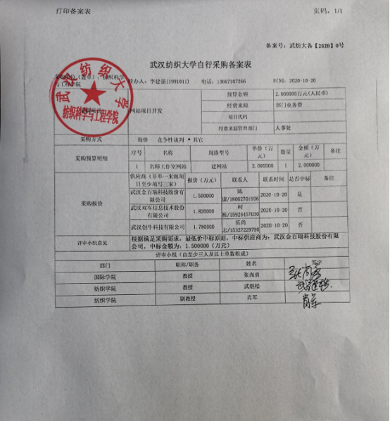 2020年纺织科学与工程学院名师工作室建设的“芒果tv 学自行采购备案表”扫描件见下图,现予以公示7个工作日。公示日期为2020年10月21日-10月29日。公示期间,如对采购结果有异议,请于10月29日16:00前联系学院办公室反映。
