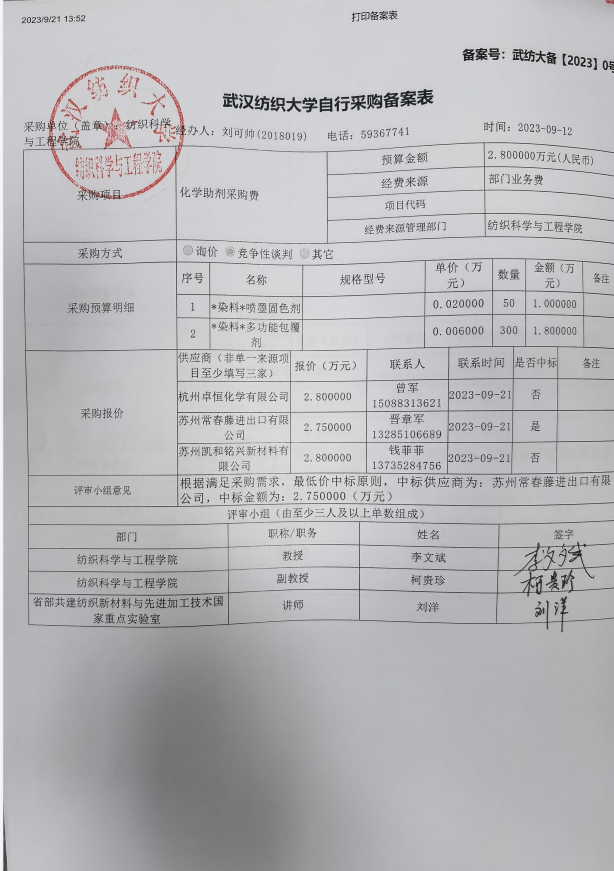 关于化学助剂(染料)采购公示