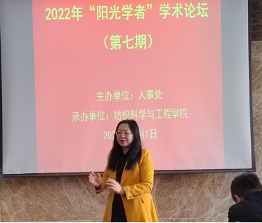 论坛上,邹汉涛、程德山、胡敏、周阳、黄颖、夏治刚6位老师分别以“功能非织造产品的开发”、“液态金属基织物复合材料构建及功能性研究”、“多级孔纳米纤维的构筑及其气体净化性能研究”“微/纳米材料表面化学设计与调控”“仿生矿化及再生医学领域中天然有机高分子材料的应用研究”“短纤纱成形结构性能解析及测试技术创新”为题介绍了自己的研究课题和目前取得的研究进展,并分享了自己的科研经验。主讲内容涵盖了非织造材料、复合材料、多级孔纳米纤维、微/纳米材料等领域,代表了学院最新研究进展,营造了良好的学术氛围。