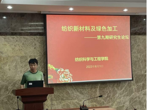 论坛上,黄继虎、戢岳阳、金鑫鹏、梁书运、耿瑮五位同学分别介绍了自己的研究课题和目前取得的研究进展,并分享了自己的科研经验。主讲同学的研究课题涵盖了二维机织物结构及其复合材料、柞蚕丝微纳米纤维、纤维-气凝胶多层复合三维织物、等离子体处理的纤维素针织物、抗湿粘附织物等领域,契合了“纺织新材料及绿色加工”主题,代表了学院最新研究进展,营造了良好的学术氛围。