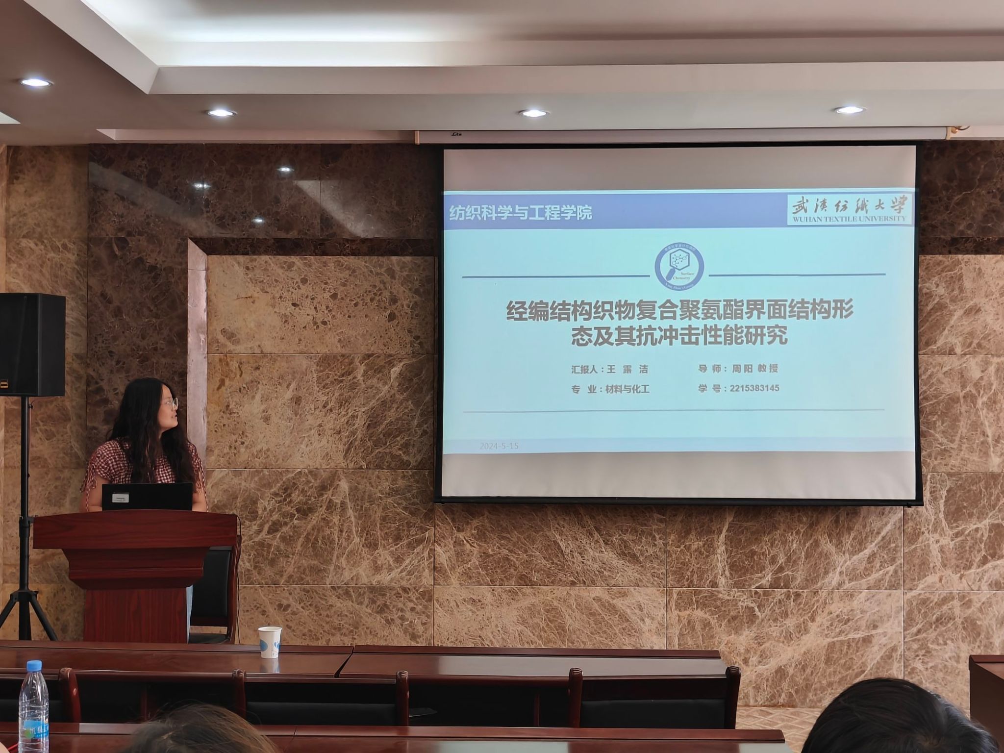 论坛上,吴桂林、郭锦章、王露洁、高晶晶、唐琪5位同学依次介绍了自己的研究课题和目前取得的研究进展,并分享了自己的科研经验。主讲同学的研究课题包括多层级结构抗冲击复合纱线及其织物、蚕丝纳米纤维复合材料、经编结构织物复合聚氨酯界面、UHF RFID转能器、新型有机无机阻燃体系,契合了“纺织新材料及绿色加工”主题,代表了学院最新研究进展,参会人员积极提出问题和建议,营造了良好的学术氛围。