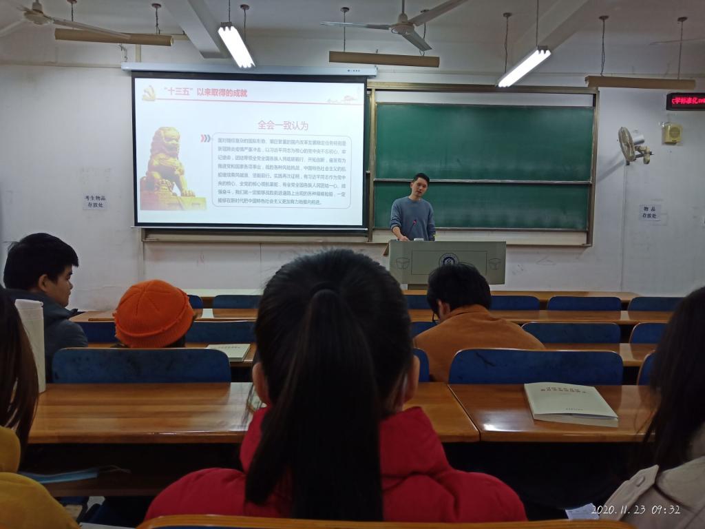 讲座上,李亮老师介绍了中国共产党第十九届中央委员会第五次全体会议主要议程,引导大家明确十九届五中全会的重要意义。他强调,学生应当把党的十九届五中全会关切落实到实际工作中去,以更高的标准,更大的干劲,更好的作风,更严的纪律,立足本职,忘我工作。推动“十四五”时期我国经济社会发展,必须坚持党的全面领导,坚持和完善中国特色社会主义制度,不断提高贯彻新发展理念能力和水平。通过此次讲座,在李亮老师倾心的讲解和同学们的认真聆听下,同学们备受鼓舞,倍感振奋,对未来充满信心。