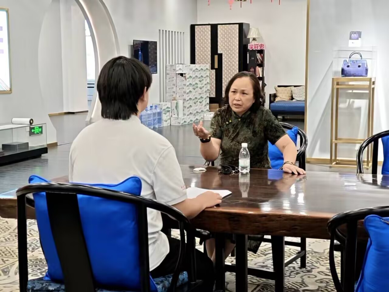 随后,团队代表与宋锦非遗传承人展开深度访谈,聆听技艺传承背后的故事与坚守。团队成员了解到钱小萍、吴建华等一批批非遗传承人在宋锦传承者几十年如一日的坚守,在创新思变中创建“上久楷”品牌,成立集科普教育、创意产业、生态休闲、旅游购物于一体的宋锦文化产业园,与国内外顶尖设计师和院校进行合作……最终,引领宋锦走出国门、走向世界,“上久楷”宋锦作为国礼吸引了全世界的目光。