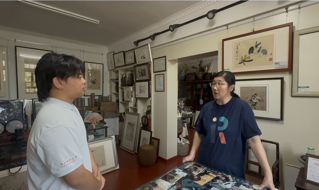 随后,实践团有幸访谈了沈绣第四代传承者周晶老师,周晶老师不仅介绍了沈绣的起源与发展,还与团队成员分享了自己与沈绣结缘的故事。谈及沈绣现代化的传承与发展,她提到:“沈绣不仅是技艺,更是文化的载体,在传承过程中,既要坚守传统针法的精髓,也要结合现代审美进行创新设计。”