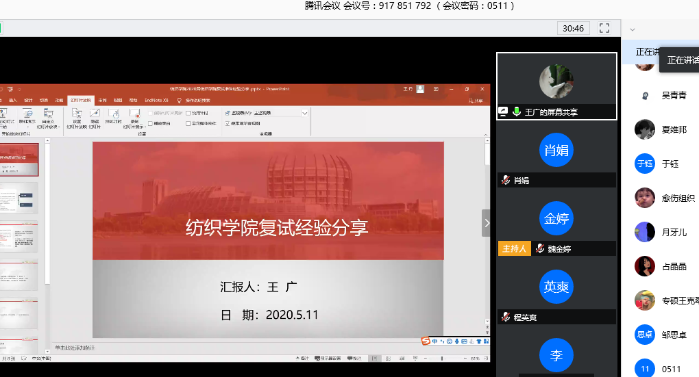 辅导员肖娟老师,东华研究生学姐王广、范天琪为考生进行了专题复试指导,各位考研学子积极参加了本次会议。