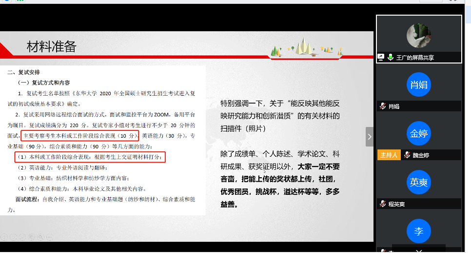 召开线上东华一对一考研复试指导会。东华大学学工处、就业处袁海源老师,毕业年级辅导员魏金婷老师,芒果tv