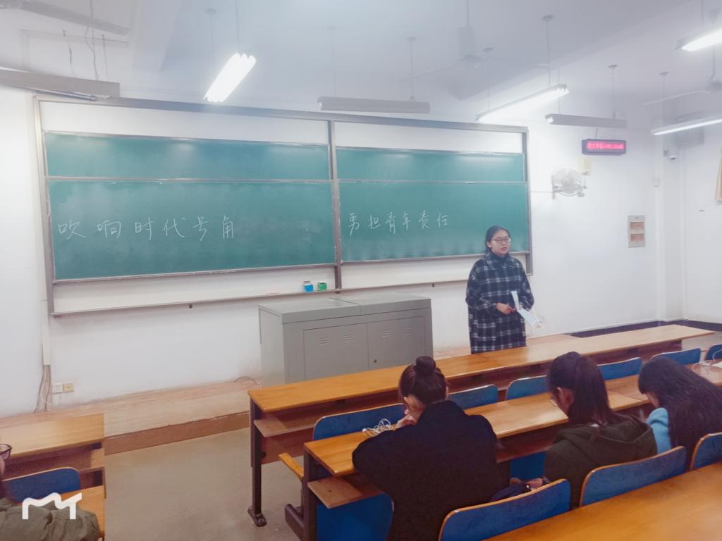 于12月2日在03-116举行了以“吹响时代号角,勇担青年责任”为主题的团课,本次团课由团委学生会副书记陈莉主持,辅导员肖娟老师、学生会主席陈一肖主讲,大一全体新生参加本次团课。