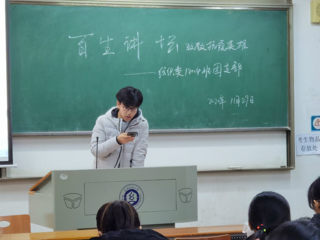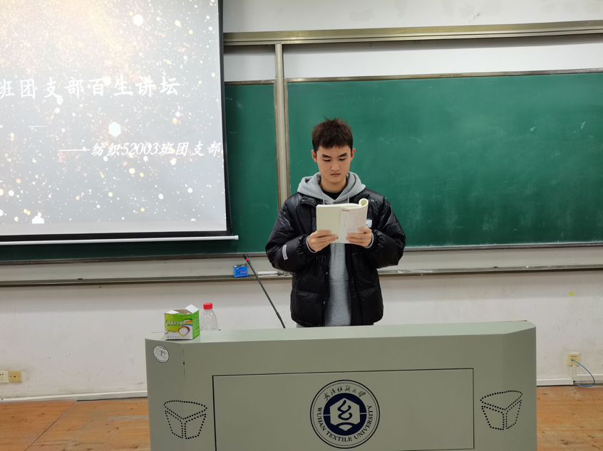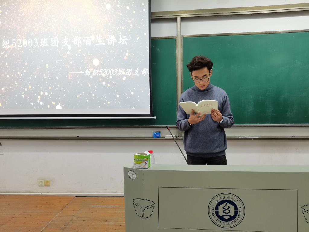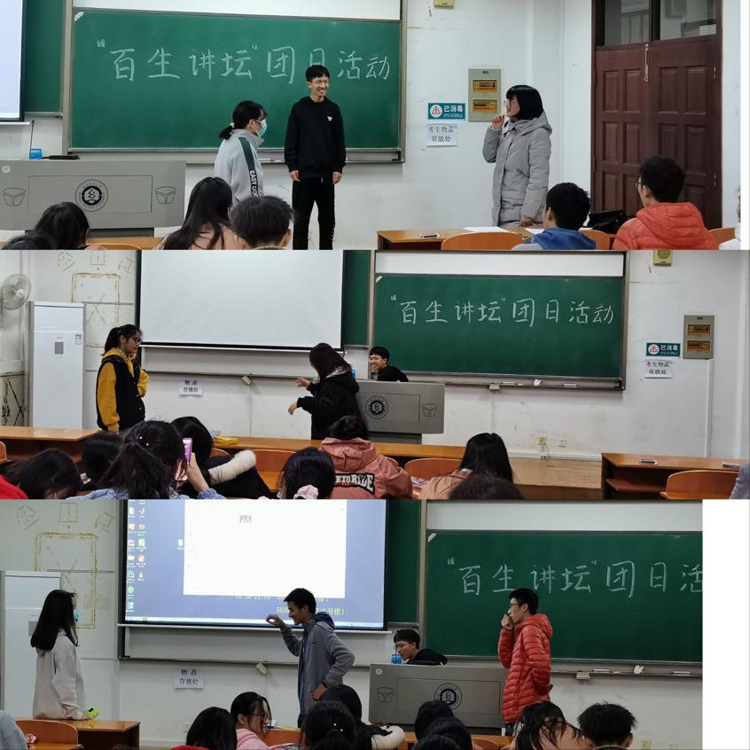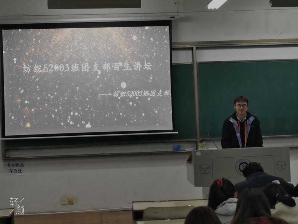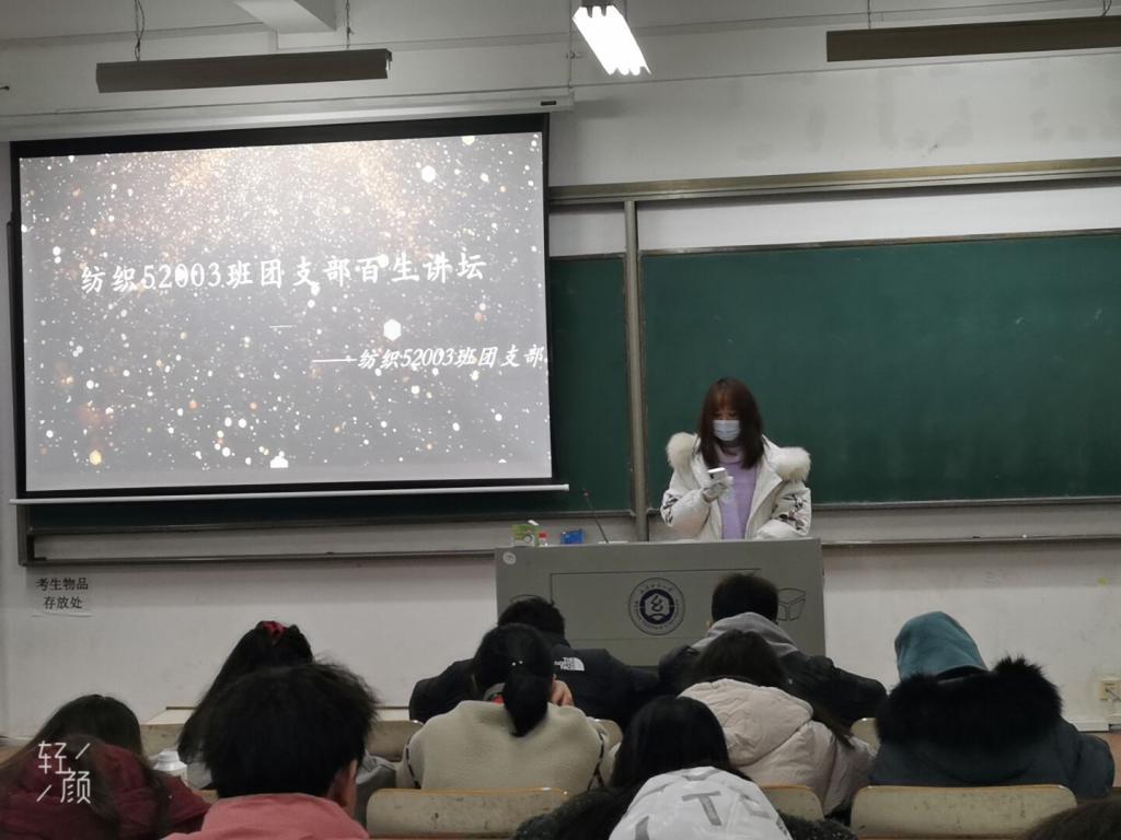 纺织12001— —52003班崇志楼开展了“百日讲坛”主题团日活动。本次团日活动由各班班委主持,辅导员吴童玲老师指导。