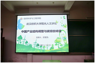 承办的第221期阳光人文讲坛在阳光校区崇真楼T101举行。本次讲坛邀请到了中国地质大学经济管理学院教授、博导、副院长於世为纺院师生带来了以“中国产业结构调整与碳排放峰值”为主题的讲坛。本次活动吸引了纺织、管理、环境等学院近200人参加。