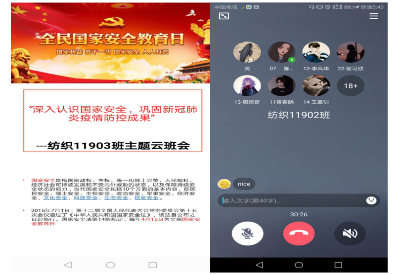 辅导员严蔷薇老师首先和17级同学们观看了中国工程院院士范维澄的《总体国家安全观视角下的疫情防控》在线课程,然后介绍了国家安全法律规定的政治安全、国土安全、军事安全、经济安全等11个领域的相关知识,最后大家就新时代大学生在国家安全方面担负的使命与任务进行了热烈的讨论。通过本次主题班会,学生们充分了解到当今国家安全面临的严峻形势,认识到国家安全对于大学生角色的重要性,充分提升了国家安全意识。