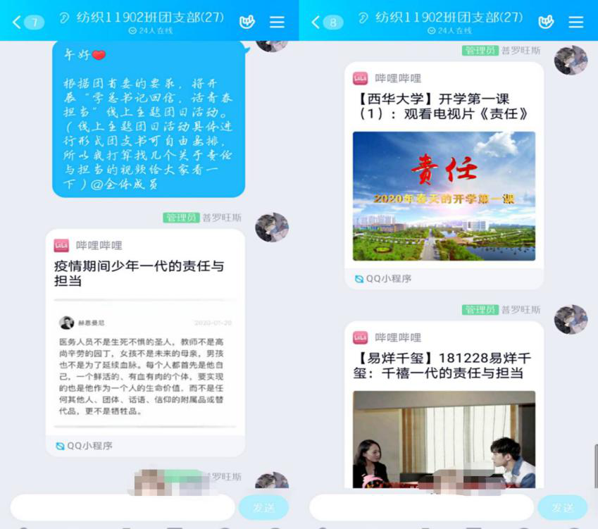 随后大家一起学习了央视新闻和“同上一节思政课”的相关视频,探讨广大青年的担当与责任。视频中有许多青年战“疫”的例子,我们从中感受到青年们的爱国情操及他们对责任的传承,最终明确青年担当,新时代青年应“胸有大志、心有大我、肩有大任、行有大德”。