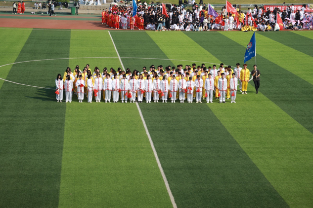的队伍第七个出场,同学们列队转弯跑步进入比赛场地。前方纺院蓝色旗帜飘扬,后方队伍紧跟旗帜,步伐齐整,气势凛然。
