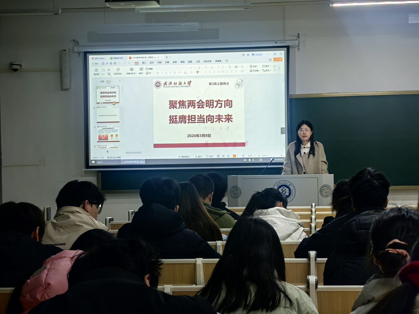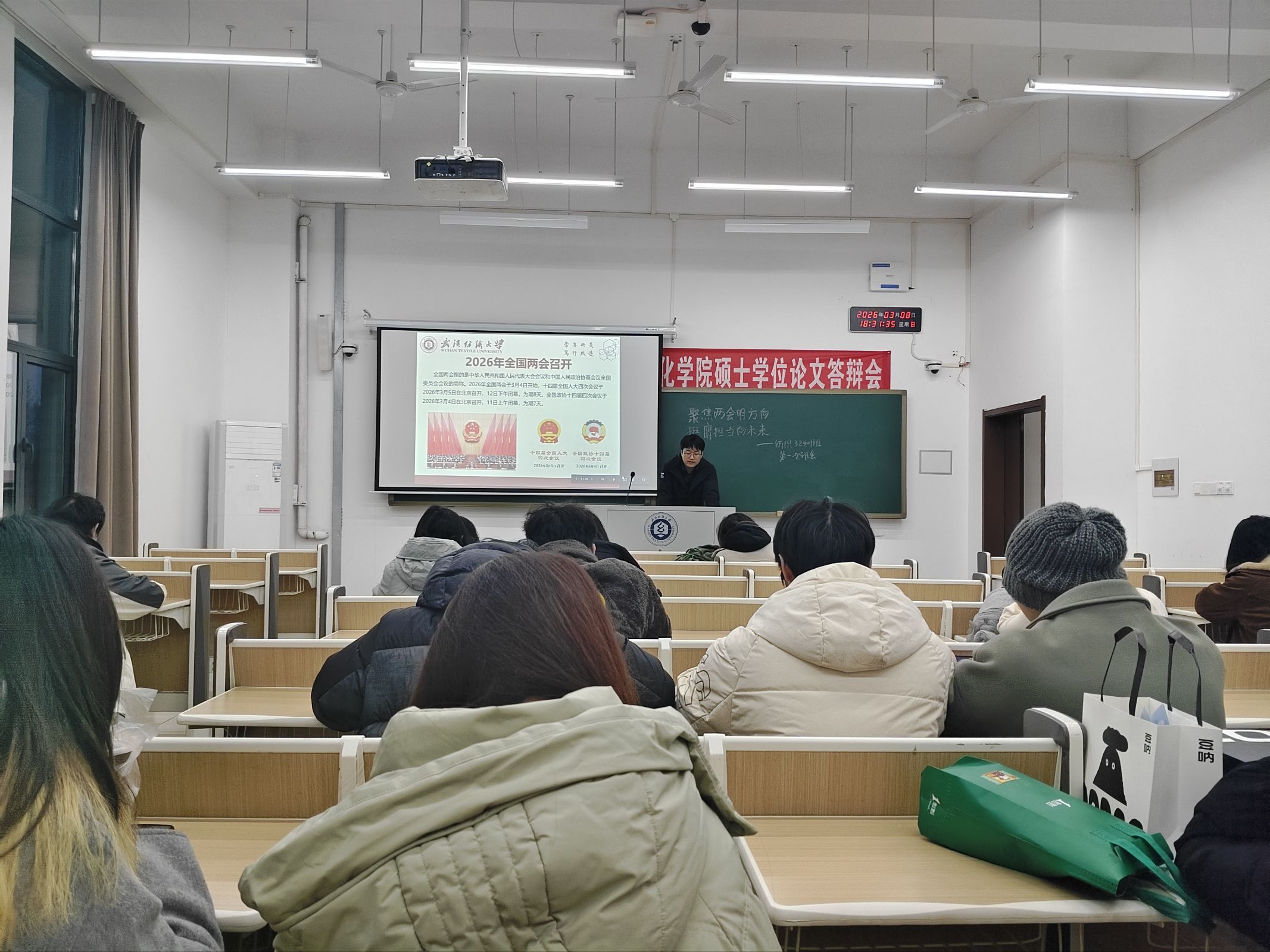 两会不仅是国家治理的“风向标”,更是青年成长的“指南针”。希望同学们以此次班会为契机,持续关注国家大事,深刻领会两会精神,将个人发展与国家需要紧密结合,在“十五五”新征程中挺膺担当,以扎实的专业知识和创新精神,为纺织行业高质量发展注入青春动能。