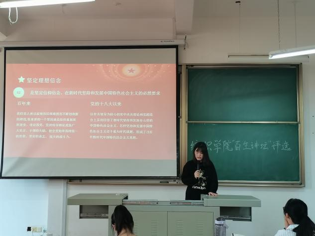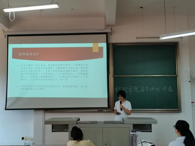 为贯彻落实习近平新时代中国特色社会主义思想,深入推进十九大“不忘初心、牢记使命”主题教育落地落实,我院团委于9月12日上午九时在8h-201开展了以“不忘初心,回顾前路”为主题的百生讲坛活动,参加本次活动的有我院团委书记张竣青、全体辅导员老师和部分20级主动报名的候选学生。