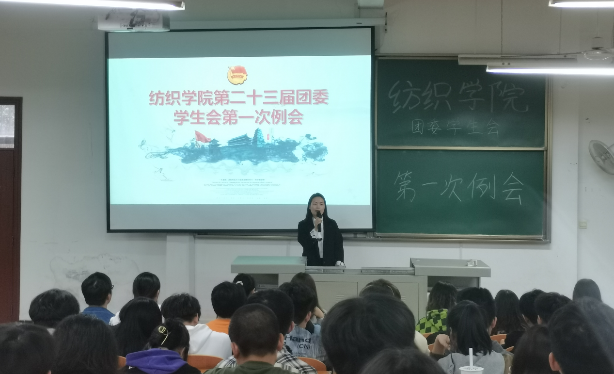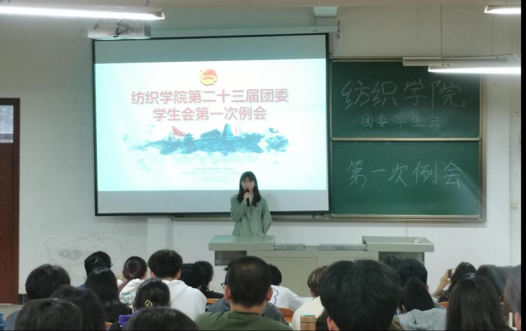会议伊始,全体成员肃立唱团歌,为会议营造庄重的氛围。随即由学生会主席团代表进行发言,雷雨声主席先是欢迎干事加入纺院学生会大家庭,并希望各位干事能将热情与责任投入工作之中,一起打造一个更加优秀的学生会。团委副书记崔李倩则重点提出了部门规则和工作要求,提醒各位干事要严明纪律,有计划地完成各项工作,积极配合部长的安排。紧接着,由各部门部长依次汇报部门近期工作情况以及后续工作安排,让各部门成员明晰目标,做到心里有底,心中有数。随后团委书记张竣青老师进行总结发言,她向各位干事提出了要求,希望大家能在学生会大放光彩,锻炼自己。最后,各部门干事依次上台自我介绍,在展示自己的同时也熟悉了各部门同事,让新一届学生会迅速由单一个体融合成集体,以轻松融洽的氛围完美收场。