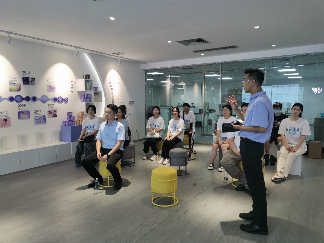 在公司工作人员的带领下,实践团成员们进入丝宝集团的R&D研发中心参观学习,听取现场负责人的讲解,实地观看研究人员对材料各项属性进行测试,领会文化产业,观看芒果tv展览片,深刻体会丝宝集团的创新创造信念,对自己所学专业与未来职业发展规划有更深层次的认识。