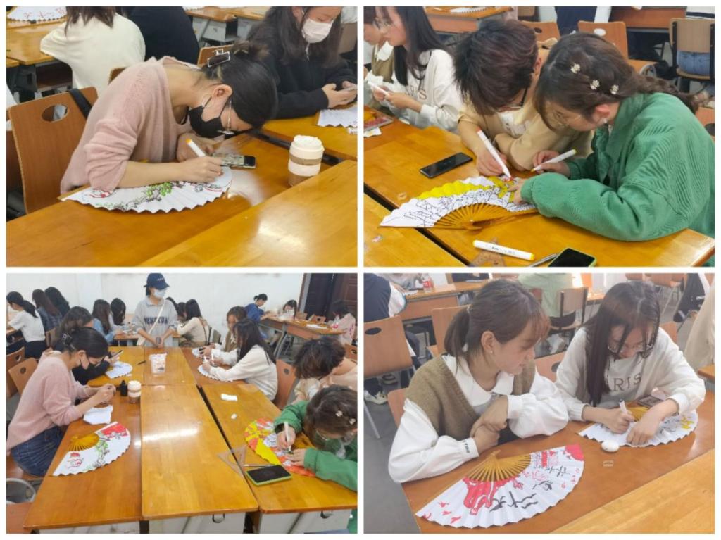 活动伊始,学院给同学们分发空白扇子以及绘图工具,同学们拿到工具后,教室里充满了激烈的讨论声,大家共同讨论扇面的布局以及配色。在讨论后,同学们兴趣盎然,纷纷拿起毛笔,在折扇上挥毫泼墨,仔细描摹,起笔,落笔,或浓墨重彩,或轻描淡写,一笔一画间包含同学们对中国传统文化的热爱,对党的深情祝福。经过同学们用心绘制下,一幅幅充满诗意雅趣、唯美精致、古色古香的扇面就制作完成了。随后老师们也共同讨论学生作品,同学们热情地展示自己的作品并交流自己制作时的心得与体会。活动最后,老师们与同学们共同合影留念,记录这精彩的活动。