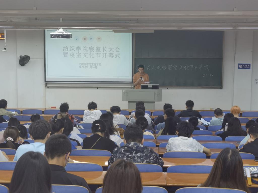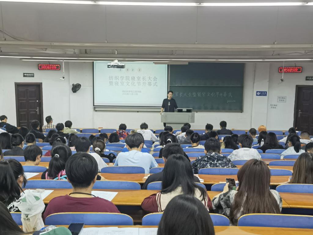 于11月10日在03- T102 开展了“寝室长大会暨寝室文化节开幕式”。本次大会由纺织学院党委副书记李亮、团委书记梁祥云、22 级辅导员王然和各寝室长共同参与。