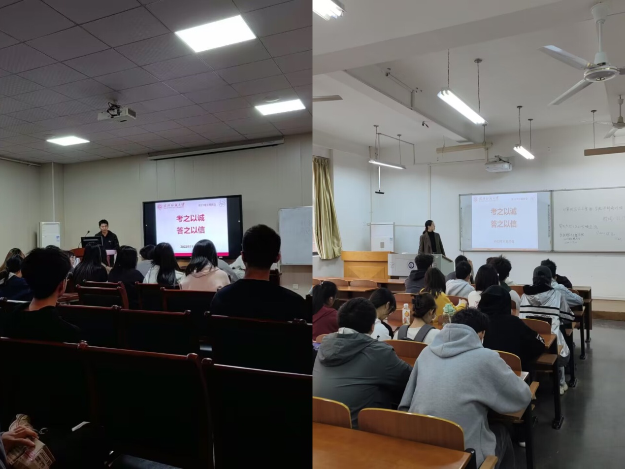 始终高度重视学生的考风考纪教育,坚持严抓考风考纪,以考风促学风。为整治考试作弊,培养良好学风,落实立德树人根本任务,提高大学生“以诚立身、以信致远”的良好品质,于11月20日在3栋教学楼集中召开了 “考之以诚、答之以信”的考风考纪主题教育。