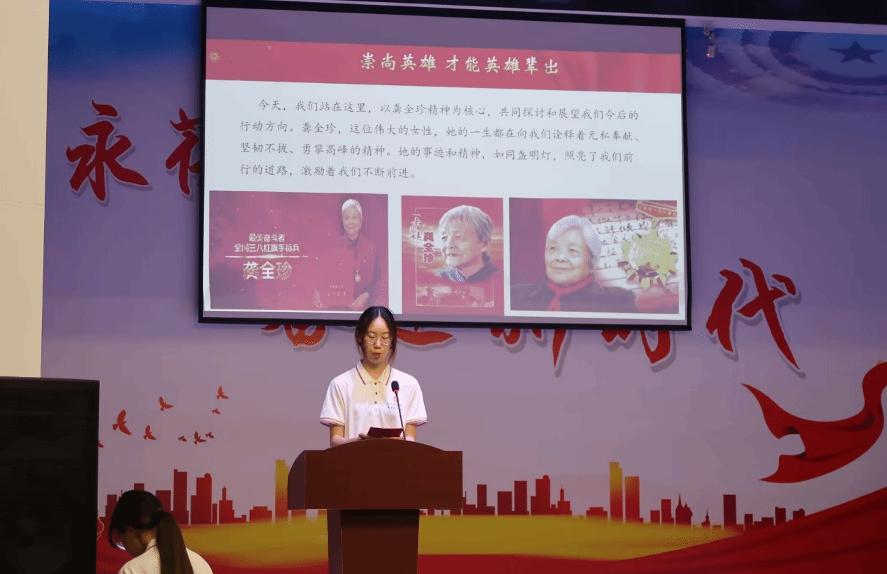 图为实践团成员为台下观众宣讲“龚全珍精神”