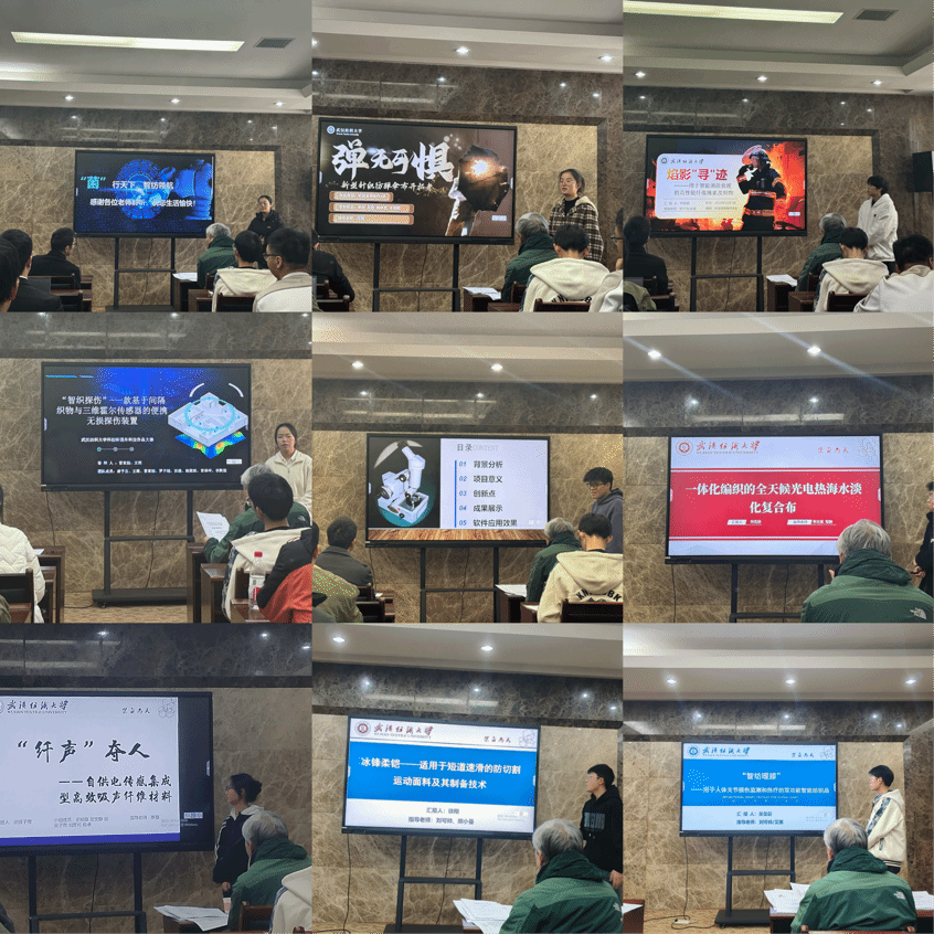 本次大赛由各项目汇报人以答辩展示的形式依次进行。周楠介绍了“‘菌’行天下 -基于细菌纤维素的智能纺织品开发”项目,赵登介绍了“如虎添翼-光热双隐身的设计与开发”项目,尹思雨介绍了“聚能感应-聚吡咯在能源存储和传感监测领域的应用” 项目,叶森源介绍了“焰影‘寻’迹-用于智能消防救援的高性能纤维绳索及织物”项目,李杨介绍了“弹无可惧-新型针织防弹伞布开拓者”项目,任晋阳介绍了“穿越火线-设计可生产日常服装用玄武岩包芯纱的纺纱技术”项目,曹亚楠介绍了“智织探伤-一款基于间隔织物与三维霍尔传感器”项目,张成卓介绍了“砼智家暖-安居智控护航”项目,李环宇介绍了“成语中的纺织”项目,肖慧玲介绍了“Safe guard---基于液流纺制备的智能抗冲击纺织品”项目,王若儒介绍了“净色-色残液回收利用测试仪器”项目,陈运娜介绍了“炽焰防线:快速制备高强度SiO2-Kevlar气凝胶纤维用于极端热管理应用”项目,金郑萍介绍了“芨芨可为-基于靶向控制晶体的万层叠页白芨敷料”项目,华克润介绍了“一体化编织的全天候光电热海水淡化复合布”项目,曲昶宇介绍了“玄武岩纤维碳板鞋”项目,胡诗琪介绍了“资源利用视角下的汉麻新型制备工艺和衍生功能产品”项目,施延帅介绍了“ThemroSense 智温感药物缓释智能织物”项目,胡黄子雨介绍了“‘纤声’夺人—自供电传感集成型高效吸声纤维材料”项目,徐翔介绍了“冰锋柔铠-适用于短道速滑的防切割运动面料及其制备技术”项目,吴显彰介绍了“智纺暖膝——用于人体关节损伤监测和热疗的双功能智能纺织品”项目,刘美亚介绍了“静谧哨兵—智能喉部监测貼解决睡眠打鼾问题”项目。