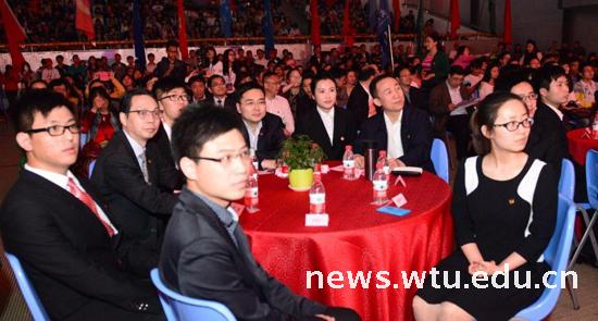 (邓雄<左一>与校党委书记尚钢、校长韦一良在嘉宾席上)