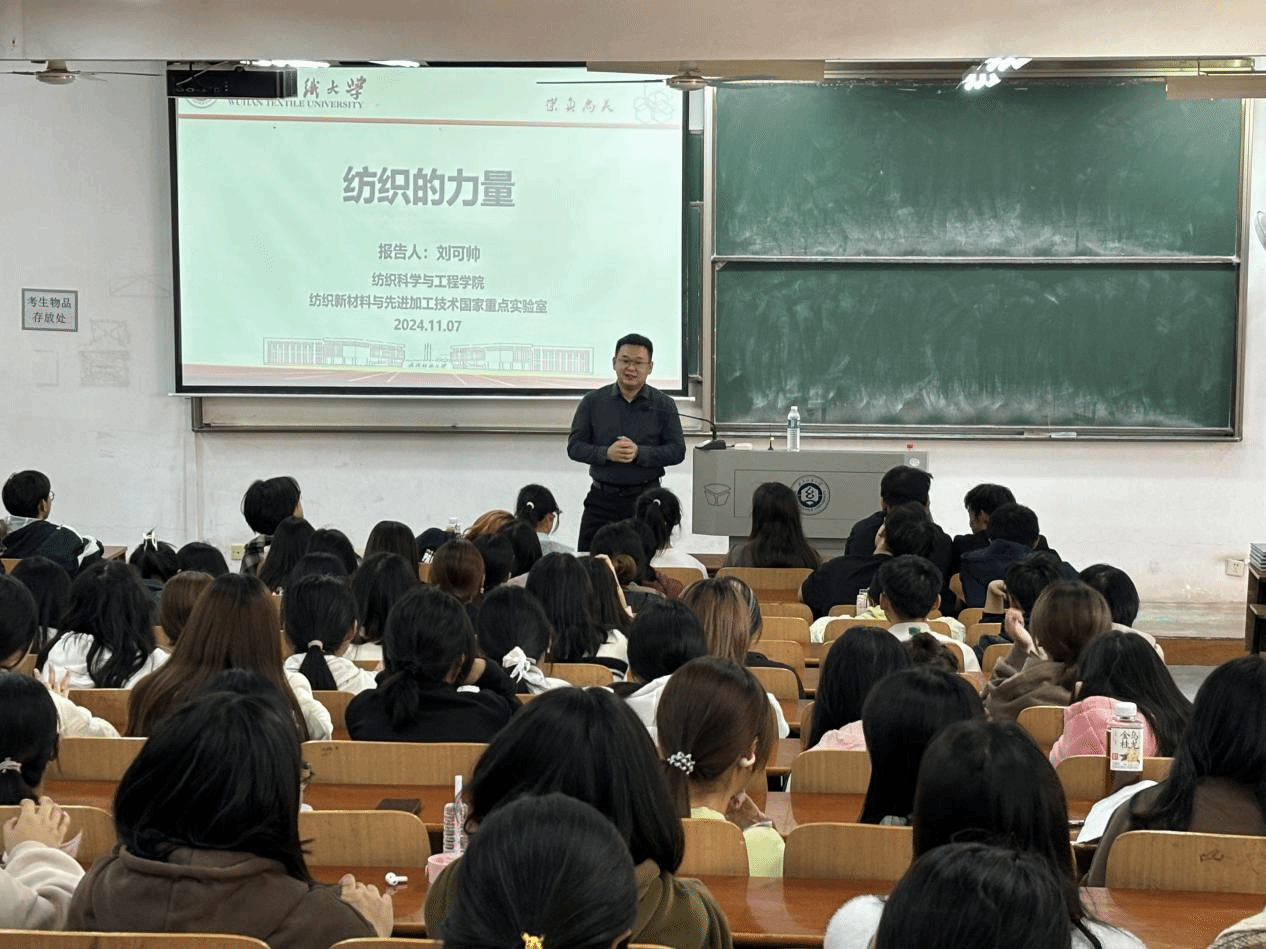 邀请中国纺织工程学会会员,湖北省楚天青年人才,武汉市黄鹤英才,湖北省纺织工程学会秘书长刘可帅老师于YG03-119为全体24级本科生开展《纺织的力量》主题讲座。