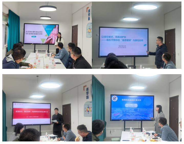 薛萍老师以《从应急处置到事前预防:危机管理的前瞻性思考》为题,通过对典型心理危机事件的系统复盘,强调校园安全管理应树立“防患于未然”的理念,通过完善制度机制、加强日常排查、实施分类施策、深化家校协同,构建“早发现、早干预、早化解”的全流程工作闭环。微电子学院方林老师以《以信任破冰,用真诚护航——危机干预中的“信息密钥”与家校协同》为题,从心理育人和沟通策略角度出发,分享了在危机干预中如何与学生建立信任关系、走进学生内心,实现“情感介入”与“问题疏导”的有机统一。机械学院徐智航老师围绕《直面挑战、稳住阵脚:构建辅导员危机处置办法》,系统梳理了危机发生后的标准化应对流程,强调在复杂情境中保持冷静判断、依法依规处理,并提出了“情景模拟+复盘推演”的能力提升路径。经济学院马晓雪老师则以《校园危机协同处置实战录》为题,结合真实案例,深入剖析了多部门联动与家校医协同在危机处置中的关键作用,指出信息畅通、角色清晰、资源整合是提升协同处置效能的核心要素。