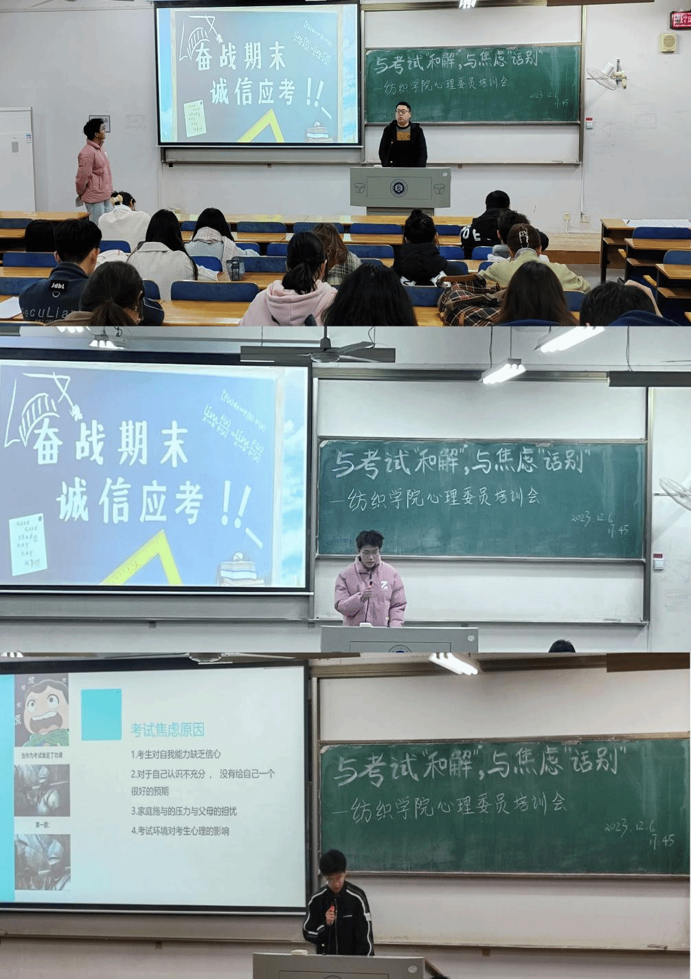 通过本次心委培训会,心理委员们了解了考前焦虑的来源和影响,也知道了如何帮助本班级的同学正确应对考前焦虑、和考试“和解”,让心理委员们能够真正帮助到同学们,共同成长,和谐心灵。也让纺院的同学们对考前焦虑有了更深刻的理解并且能更好地面对考前焦虑,为纺院营造“阳光心态,轻松应考”的良好考试氛围打下坚实基础。