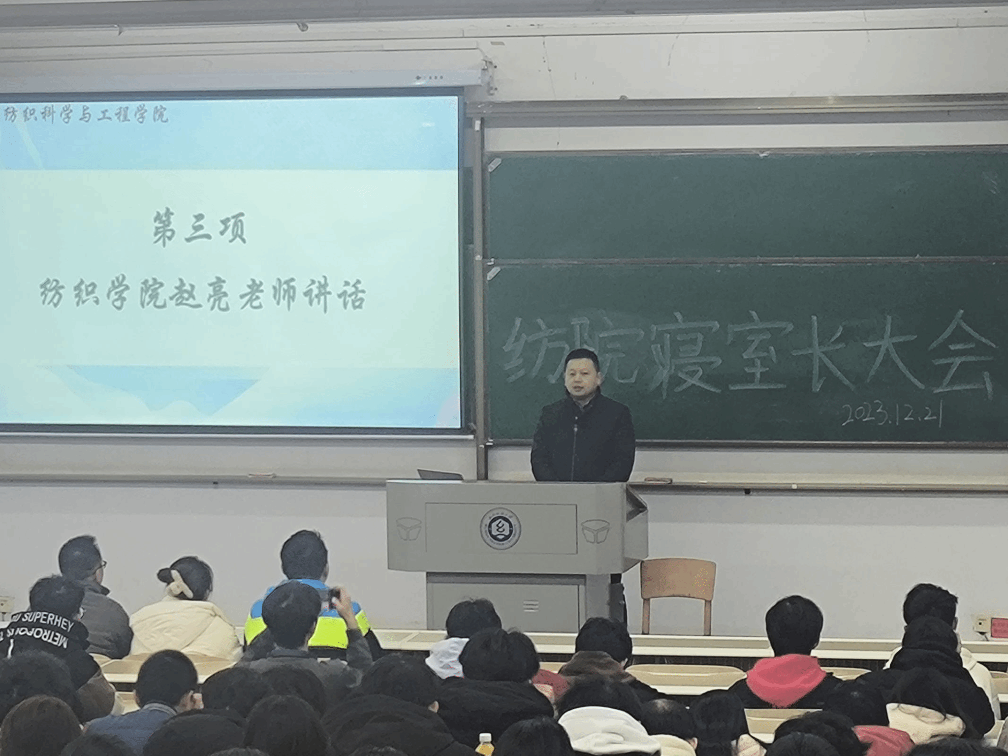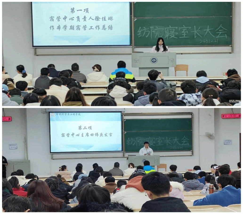 宿管中心部长徐佳琳对宿管中心本学期的工作进行了总结汇报,指出查寝工作存在的一些问题,寝室长要积极配合宿管中心工作,同时希望同学们继续监督宿管中心的工作,共同创造安全文明的寝室环境。宿管中心主席田伟庆强调了节假日归寝查寝要求和寝室的用电安全问题,提醒同学们要遵守规章制度,养成安全用电的习惯,营造安全稳定的生活学习氛围。