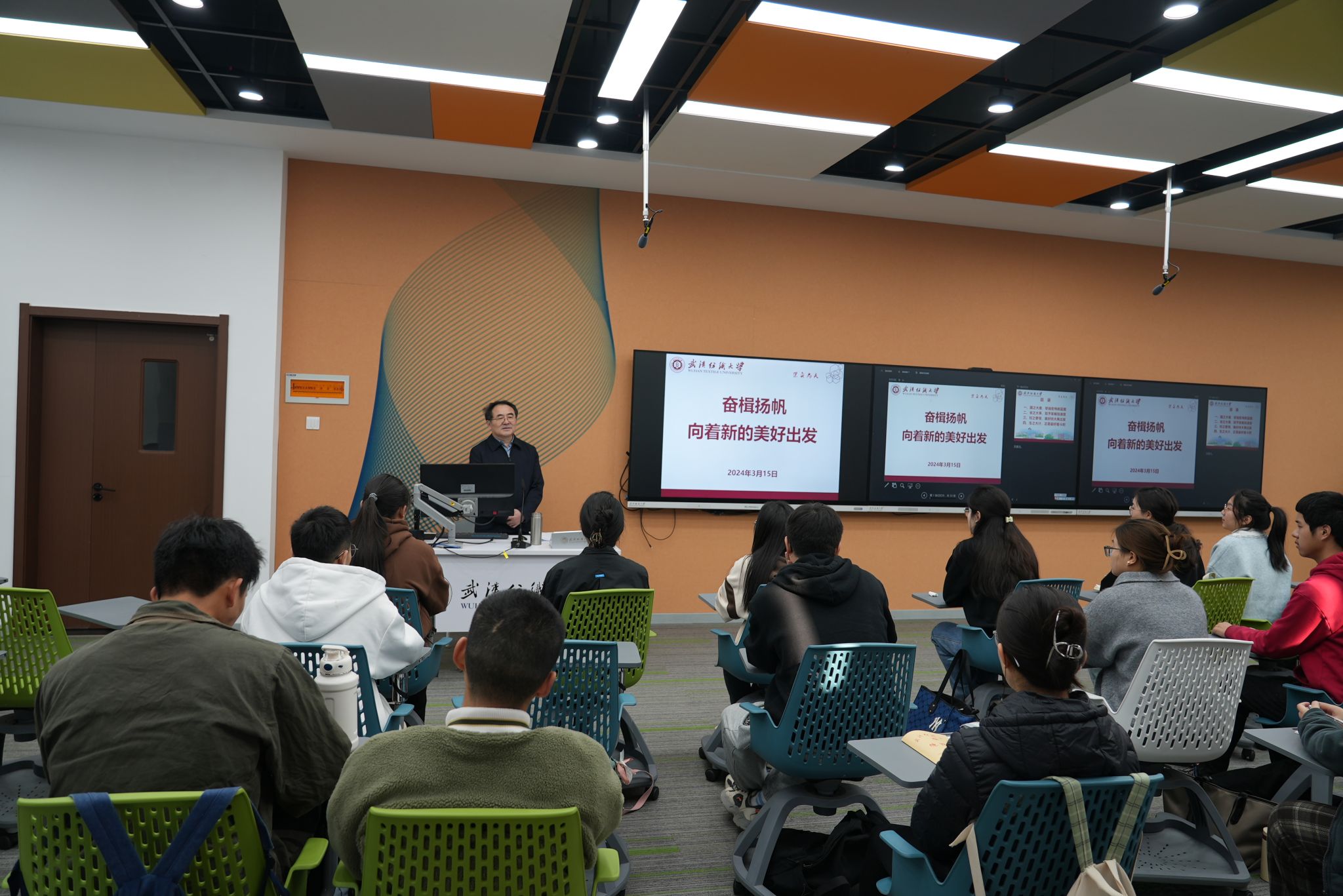 班会现场,学生们正以翻转课堂的形式围绕“纺织科技与新质生产力”的主题 展开热烈讨论,分享交流学习体会。田辉玉走进学生们中间,询问大家的探讨成果,对其充分肯定,并以“奋楫扬帆,向着新的美好出发”为题讲授开学第一课。