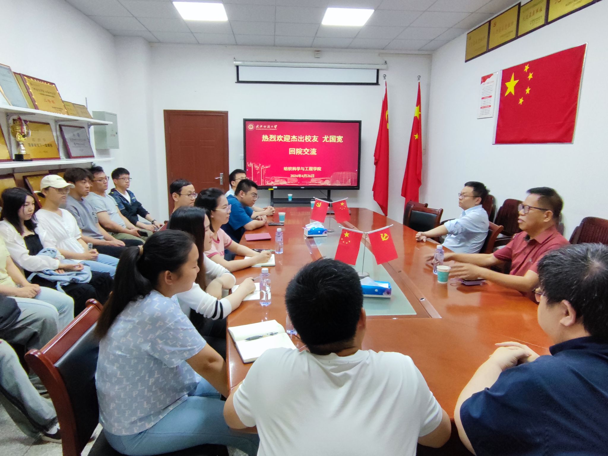 蔡光明代表学院对尤校友的到来表示热烈的欢迎,并向一直以来关心母校和学院发展的广大校友表示诚挚的谢意,并提前祝广大校友“五一”快乐。同时就学院的发展情况特别是申博及一流专业建设最新进展作了简要介绍。