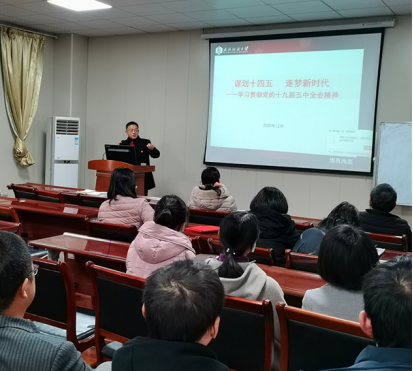 12月10日下午,芒果tv 在8H502召开党的十九届五中全会精神宣讲会,学校宣讲团成员、校办主任杜新年为学院全体教职工作了《谋划十四五 逐梦新时代》的宣讲报告。报告会由学院党委书记张红鑫主持。 杜新年结合“十四五”时期的重要意义、十九届五中全会的重要内容,并围绕《中共中央关于制定国民经济和社会发展第十四个五年规划和二〇三五年远景目标的建议》和习近平总书记在全会上的重要讲话深入阐释了党的十九届五...
